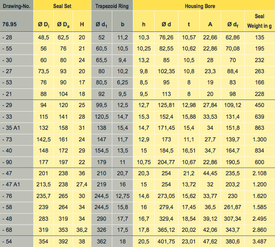 76.95型相對于76.90H和76.97H型,需要的安裝空間較小,對應溝槽的形狀更易于加工,但是,該系列的密封所對應的溝槽具有更高的加工精度要求。由于梯型橡膠圈與O型橡膠圈的壓縮形變不同,必須嚴格安照所規(guī)定的壓縮尺寸和間隙進行安裝。如果間隙過小,有可能導致密封面冷焊,如果間隙過大,則有可能導致漏油。同時,加工尺寸的偏差也會影響橡膠圈的彈性儲備,縮短使用壽命。